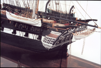 44-gun frigate, built at Hartt’s Shipyard in Boston in 1797. Presented full hull style, 1812 configuration. Solid full hull, planked-over above the waterline, copper sheathed and authentically painted. Complete deck details and armament including seven ships boats; rigging is extremely detailed and shows yards on a slightly canted port tack.