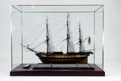 United States 32-gun frigate designed by William Hackett and built by Enos Briggs of Salem, Massachusetts, in 1799. She was presented to the United States Government by the citizens of Essex County, Massachusetts and participated in the Barbary Wars and the War of 1812. The model has a semi-solid wood hull construction, with built-up gun decks, applied bulwarks and laid decking. The paint scheme shows its as built configuration with ocher topsides and black thick wale, while the bottom is fully copper sheathed. Authentic ship rig, complete and accurate deck gear, armament, fittings, and decorative work including a figurehead of a full dressed Indian warrior and scroll work on the stern. The model is mounted on a custom fitted stained mahogany and burl wood veneered baseboard, with a glazed cover trimmed in brass, and engraved name plaque.