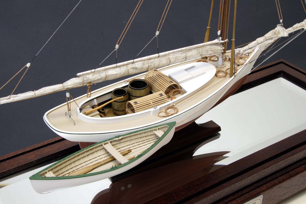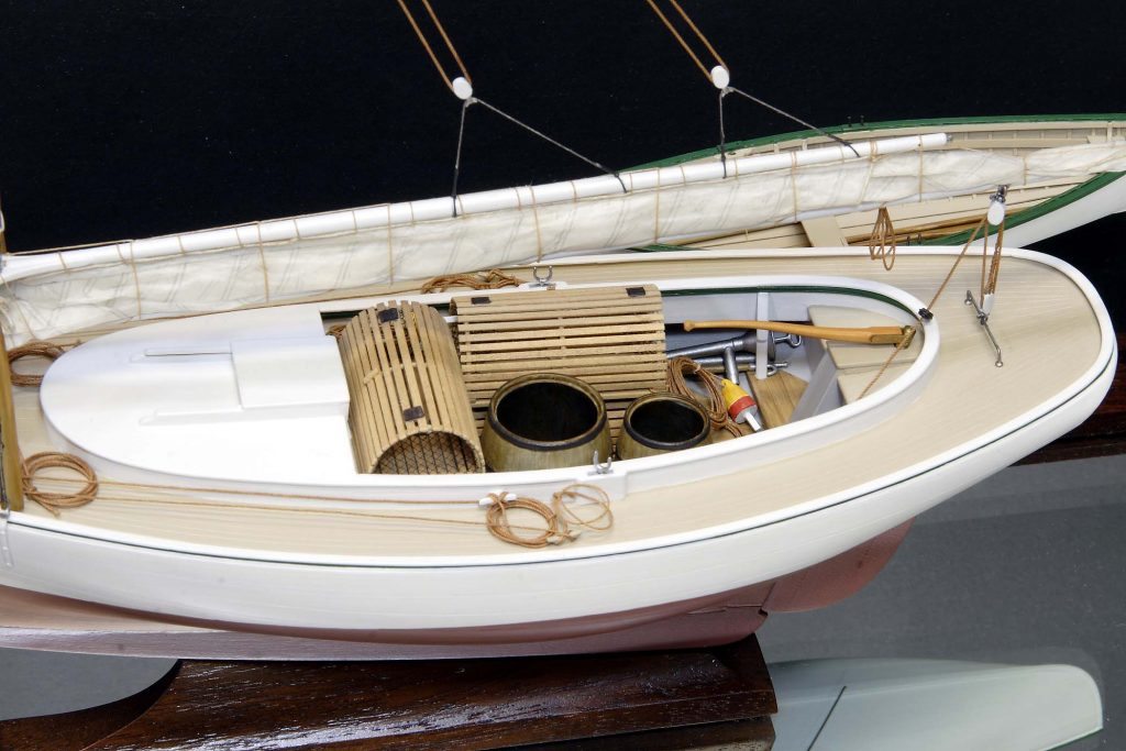 This comprehensive model is the culmination of extensive research by Mr. Ronnberg. It is fully and authentically painted, fitted out with all appropriate lobstering gear, three traditional traps, and rigged with furled sails. It includes a beautiful separately crafted fitted Peapod tender, the type used to access the sloop while at its mooring. The model is mounted on a custom mahogany baseboard with raised inner plinth with beveled mirror insert; glazed cover trimmed in brass, and pewter engraved name plaques.
