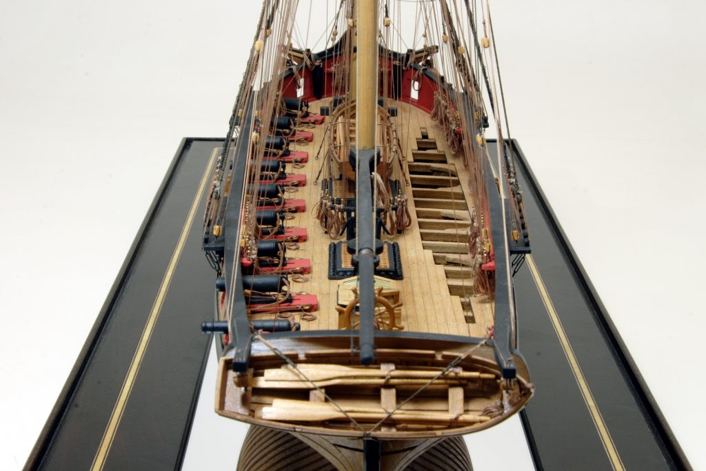 Designed by Benjamin Hutton, Jr. and built by Nat'l Hutton at Philadelphia. The brig was launched in 1803, went into commission early in September; together with Argus then went to the Mediterranean. She measured 93' 3 1/2" between perpendiculars, 27' beam, and 12' 6" depth. Plank on frame, exposed framing both port & starboard sides below the waterline and planks removed on the starboard side deck exposing deck beam structures.