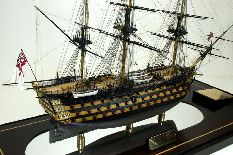 Lord Horatio Nelson’s flagship contemporaneous to the famous Battle at Trafalgar, 1805. A First-rate ship of 102 guns, Victory was built at Chatham Dockyard in 1765. After Trafalgar and much damaged, she was towed to Gibraltar and finally returned to Portsmouth, arriving in December 1805, bearing her dead Admiral.She was repaired at Chatham, then recommissioned in March 1808, and for the next 4 years saw active service in the Baltic and off the coasts of Spain. In 1812, she finally returned to Portsmouth in December ending her sea-going life.The model is constructed via a plank-on-frame/bulkhead method, is fully planked and copper sheathed, and painted. Each deck level is completed and fitted with guns, as well as having internal lights. The rigging configuration is comprehensive with both standing and running lines. It is mounted on a fitted mahogany table with plaques and glazed cover trimmed in brass.